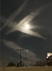 At 18:25 tonight, the sky over Fairfax County- and yours- pulled a stunt. The full moon cleared the rooftops in a hard white glare, bright enough to bleach the contrails that had been drifting east all afternoon. By chance — perfect, impossible chance — they crossed right over the moon, forming a giant asterisk in real time. You could watch it happen: the streaks thinning, spreading, sliding into alignment like the atmosphere was adjusting itself for emphasis.