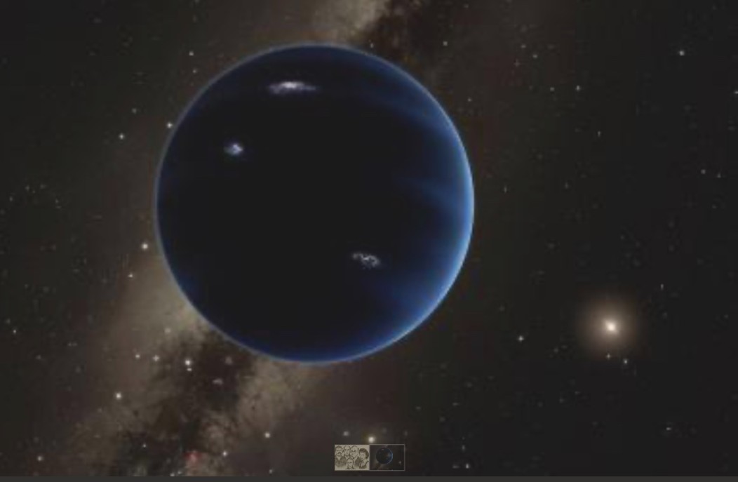 (View from Planet Nine inward toward the sun. The planet is thought to be gaseous, similar to Uranus and Neptune. Hypothetical lightning lights up the night side. Credit: Caltech/R. Hurt (IPAC).