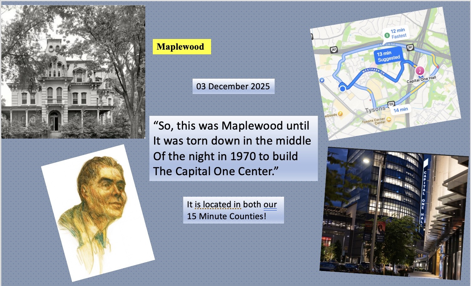 (Despite preservation efforts, the historic Maplewood Mansion in Fairfax County was demolished in the middle of the night in 1970 to accommodate construction of the Capital One Hall.  The Second Empire-style mansion dated to the early 1870s and was one of the last Fairfax examples of its architectural style).