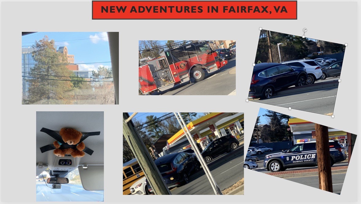 (A distant view of the world famous Shopping Bag high-rise, the “Good Luck Bear” taped to the overhead of the group mobility van, the wreck, the Fire Fighters and the Fairfax Police responded and alert drivers found a cut through off the big road and we got around it. Without use of horn. Things in motion!)
