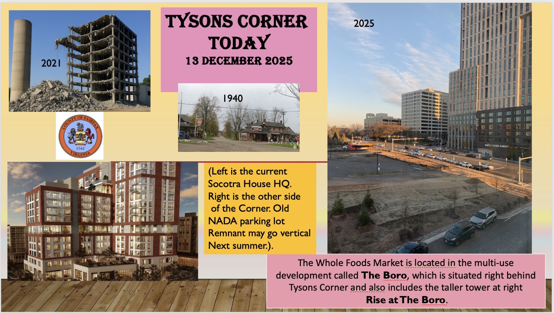 Our Zoomers- the Gen X and Y kids who already know it all and haven’t yet become aware that it is all wrong- had another poster on the way the Fairfax County board had things planned as they realized the big office complexes built atop Mr. Tyson’s corner of Peach Grove turned into vast swathes of black surrounding the proud towers.