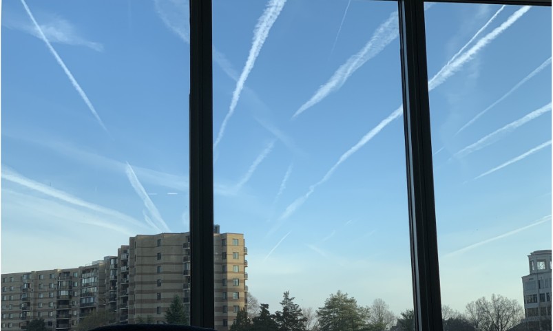 They tore down SAIC first, then NADA in 2021. We are excited about what is going to come in next door, as soon as next summer. In the meantime, before the snow, the contrails are still visible in the Eastern sky. We may lose them next year, obscured by sensible multi-use buildings like the one in which we hold our Socotra House Production Meetings.